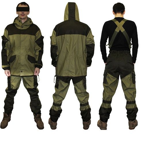 Костюм ГОРКА-3 мат.палатка (х/б с пропиткой) горный костюм изготавливается из плотной палаточной х/б ткани. В качестве отделки и усиления критических для изнашивания и промокания зон используется плащевая смесовая ткань. Костюм состоит из куртки (с 5 карманами) и брюк (с 6 карманами и удобными подтяжками) свободного покроя, и под него можно надеть другую одежду. Для лучшей посадки, прилегания и во избежание "парусения" на ветру, костюм имеет систему стяжек на основе резино-тканевой тесьмы по бокам куртки, на рукавах, под коленями и внизу брюк (портянка). Сочетание накладок с основной тканью цвета хаки, обеспечивает разбиение силуэта человека на удаленных расстояниях. Костюм предназначен для защиты от перепадов температур и сильного ветра в условиях горной местности.